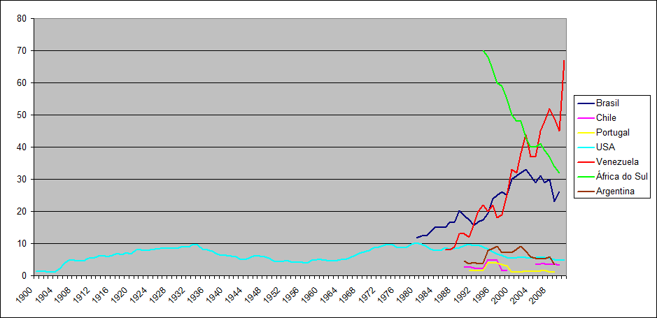 A pedido de várias famílias e relativamente a assassinatos, aqui vai um gráfico incluindo alguns países escolhidos a dedo. A pedido, podem adicionar-se outros.